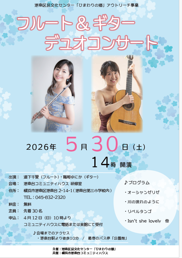 | 内容 | 港南区民文化センター「ひまわりの郷」アウトリーチ事業 出演:道下千愛(フルート)、藤尾ゆにか(ギター) |