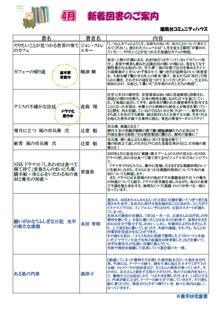 最新新刊・新着はコミュニティハウス Tel:832-2320